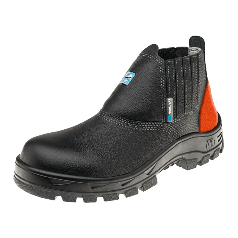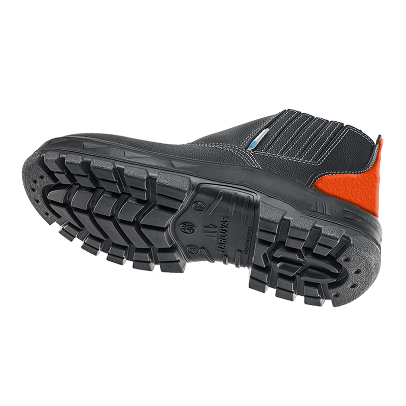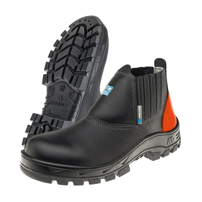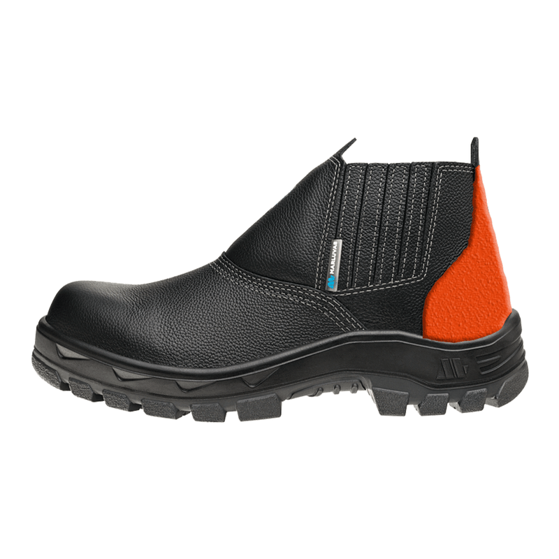 CALCADO SEGURANCA | TIPO: BOTINA | MATERIAL: COURO (VAQUETA) | FECHAMENTO: ELASTICO | SOLADO: POLIURETANO BIDENSIDADE | BIQUEIRA: COMPOSITE | PALMILHA: ANTIPERFURANTE (MONTAGEM FIBRAS) | CONSTRUCAO: CONVENCIONAL | COR: PRETA | COR TALONEIRA: LARANJA | TAMANHO: 34 a 46 | MODELO: LINHA COMPOSITE | MARCA: MARLUVAS | REF: 50B19MCPAPPAARC